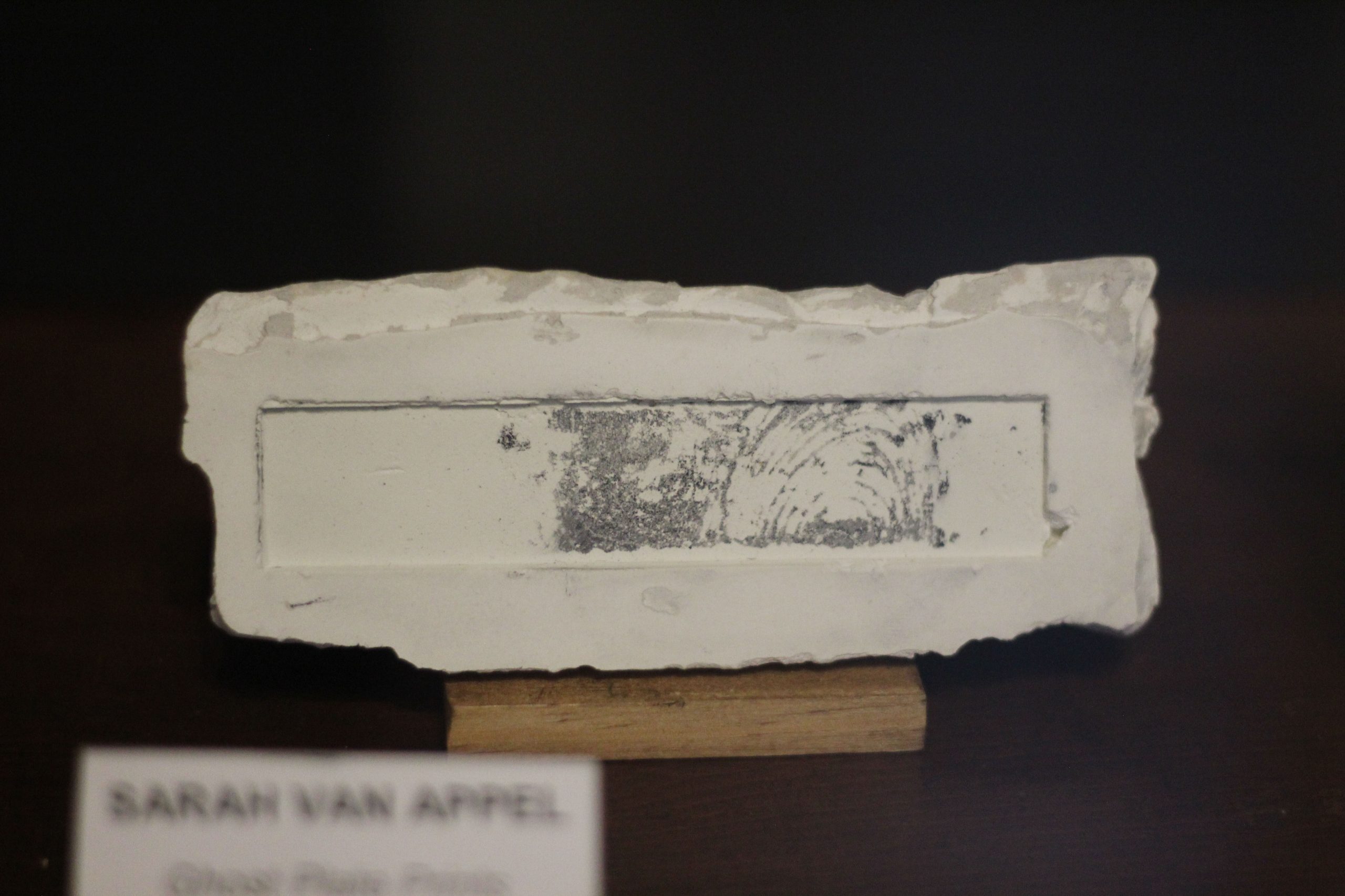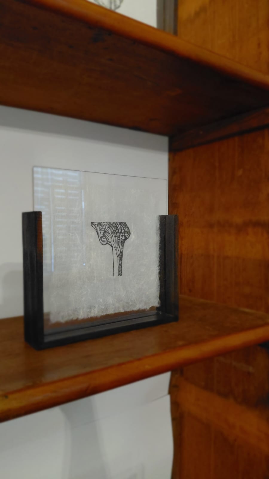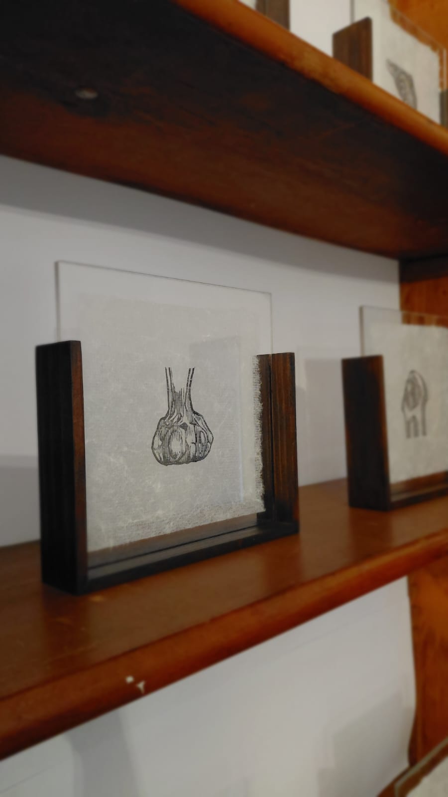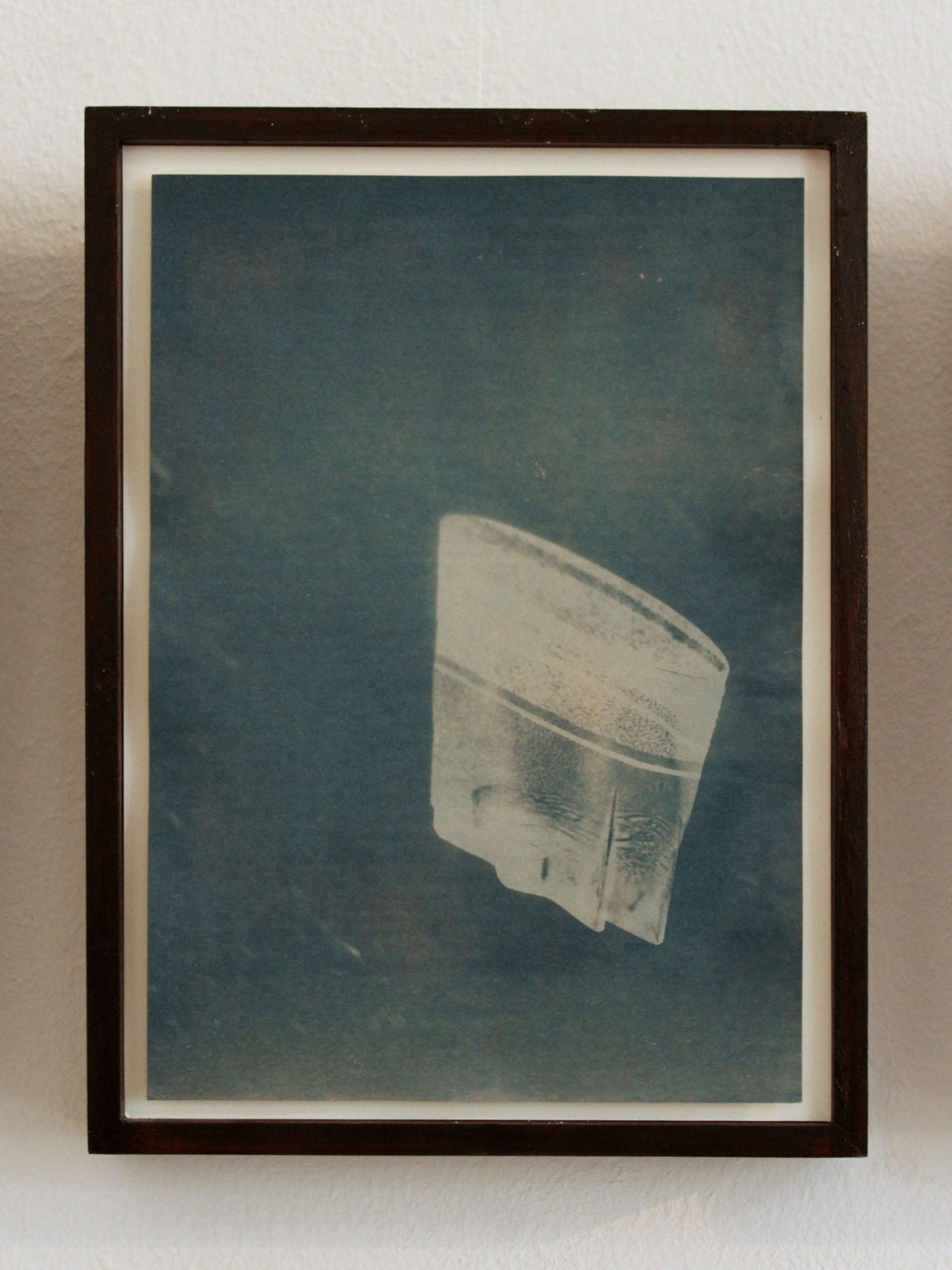 Through a practice-led, autobiographic study of my family archive, I employ reflective nostalgia within my artistic practice, with the aim to develop a dialogue between sentimentality and the creative process. By “scratching the surface” and critically processing the emotional connections I have to the artefacts, memorabilia and sacred relics within my family archive, a productive space of introspection was created. This ultimately catalysed something new, a sense of being freed of the physical and emotional weight of the actual objects. Each ‘collection’ within the exhibition encompasses some part of this journey: the capriciousness of cyanotype, changing its colour as quickly as the erratic emotions of grief; the fragility of frottage and wood carvings on tissue paper suspended in glass, revealing only part of the whole; the roughness of drypoint, unsettling yet cathartic, and the detailed yet fossil-like relief of plaster casting, standing silently as a monument of remembrance.