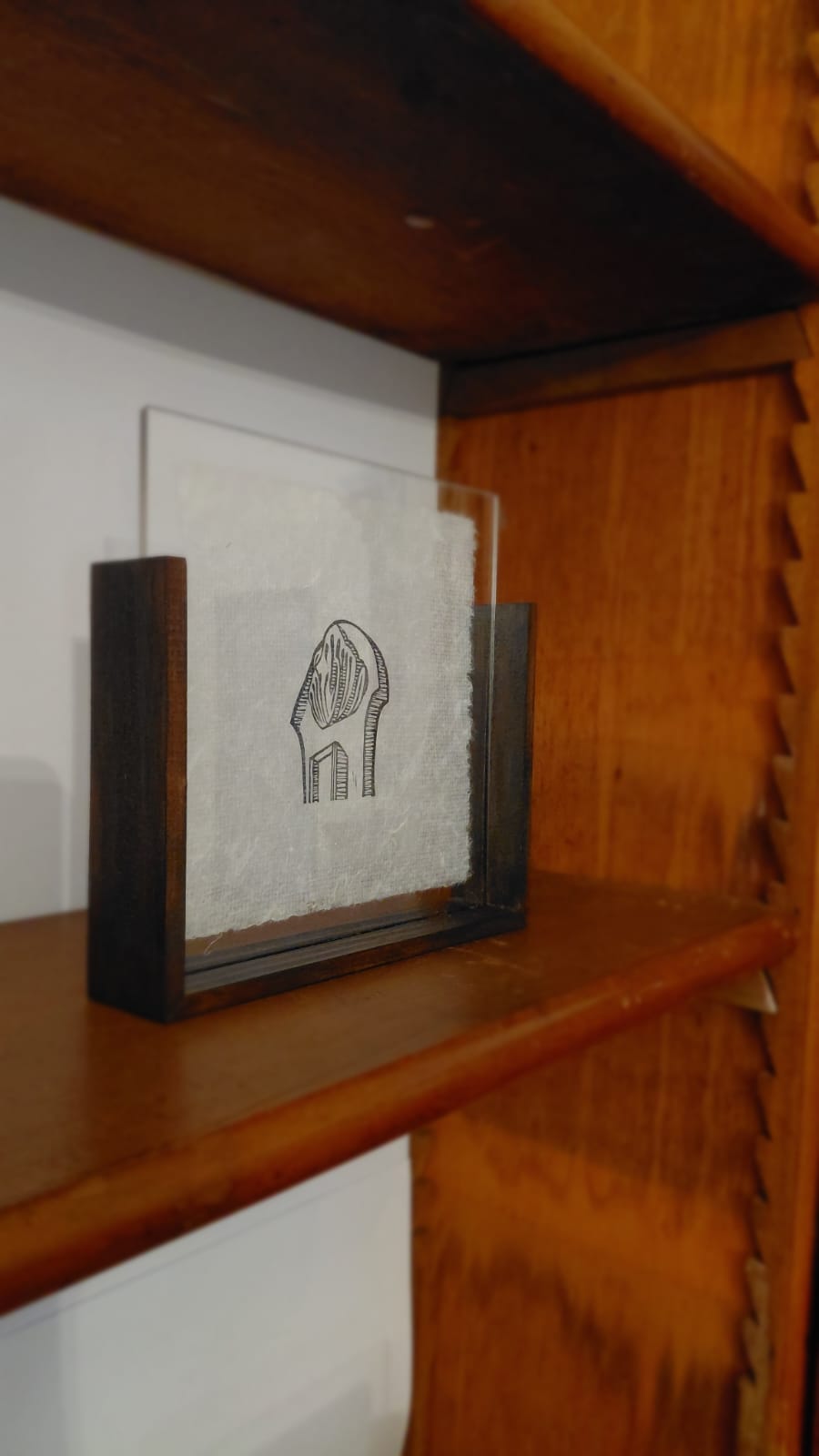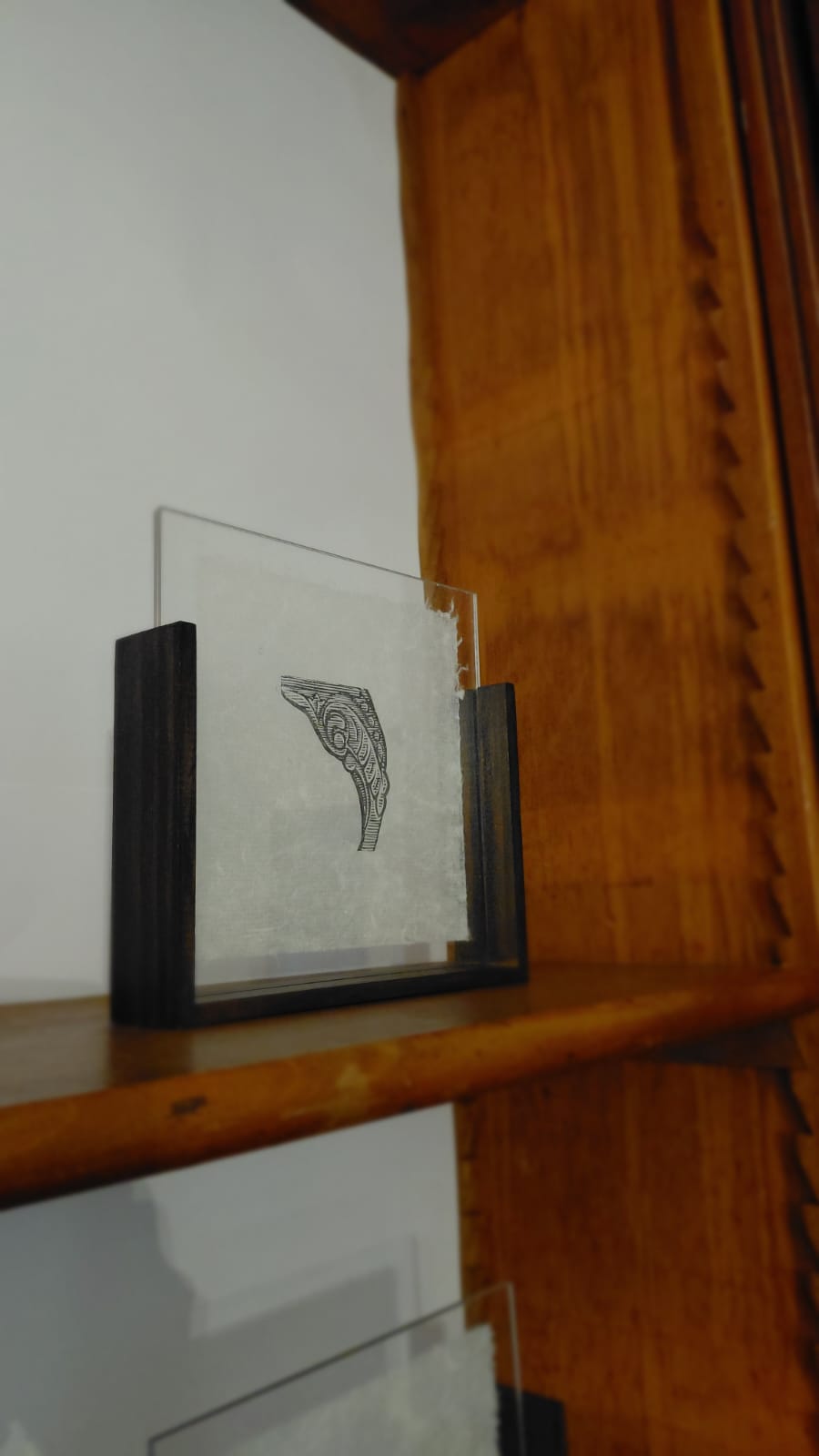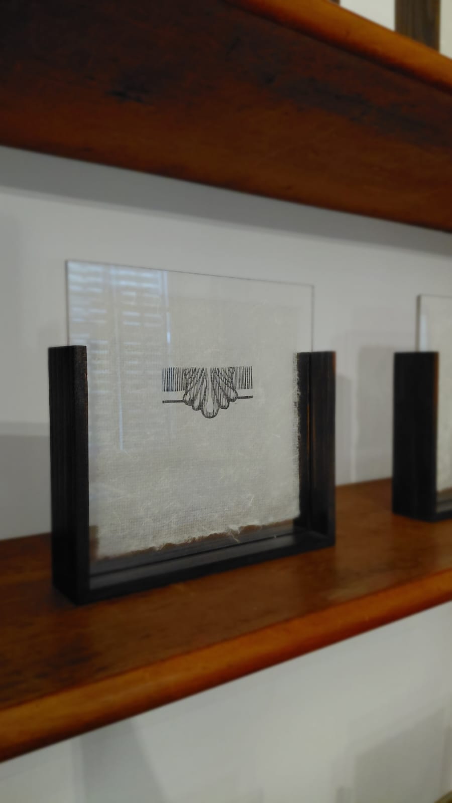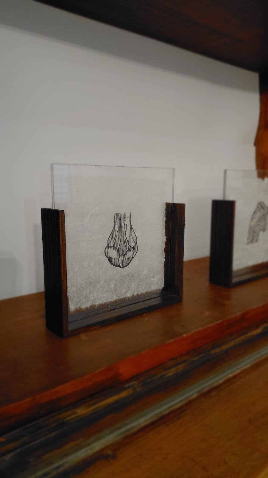 Through a practice-led, autobiographic study of my family archive, I employ reflective nostalgia within my artistic practice, with the aim to develop a dialogue between sentimentality and the creative process. By “scratching the surface” and critically processing the emotional connections I have to the artefacts, memorabilia and sacred relics within my family archive, a productive space of introspection was created. This ultimately catalysed something new, a sense of being freed of the physical and emotional weight of the actual objects. Each ‘collection’ within the exhibition encompasses some part of this journey: the capriciousness of cyanotype, changing its colour as quickly as the erratic emotions of grief; the fragility of frottage and wood carvings on tissue paper suspended in glass, revealing only part of the whole; the roughness of drypoint, unsettling yet cathartic, and the detailed yet fossil-like relief of plaster casting, standing silently as a monument of remembrance.